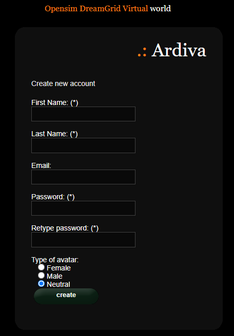 - First Name (es. Mario o Maria o Anacleto...fai tu) - Last Name (es. Rossi) - Email (non necessario) - Password (es. Abc456mGG) - Retype Password (ripeti la password per evitare errori di assegnazione) - Type of avatar: Female, Male o Neutral.(sì, oltre a maschio o femmina puoi anche decidere di impersonare qualcosa di asessuato o un animale, la scelta del corpo fisico è modificabile facilmente in un mondo virtuale)