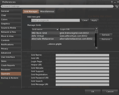 Apri Preferences. Sulla sinistra trovi l'elenco di di tutti i parametri che potresti modificare, ma per il momento puoi tranquillamente ignorarli. L'unica cosa che devi fare è aggiungere Ardalia alla lista dei mondi e per fare questo fai click sul parametro "Opensim" Vedrai comparire tutte le griglie già configurate: 3RD Rock Grid, Alife Virtual, etc.click sulla immagine per ingrandire